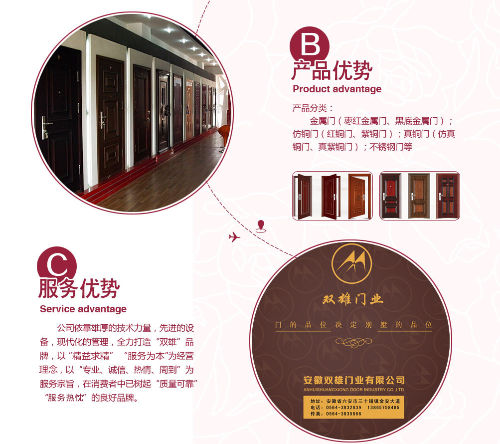 公司擁有先進的機械設備和專業的技術人員,以科技為依托,以市場需求為導向,全力打造“雙雄”品牌門!產品種類繁多:金屬門(棗紅金屬門、黑底金屬門);仿銅門(紅銅門、紫銅門);真銅門(仿真銅門、真紫銅門);不銹鋼門等。公司依靠雄厚的技術力量,先進的設備,現代化的管理,全力打造“雙雄”品牌,以“精益求精”“服務為先”為經營理念,以“專業、誠信、熱情、周到”為服務宗旨,在消費者中已樹起良好企業形象。